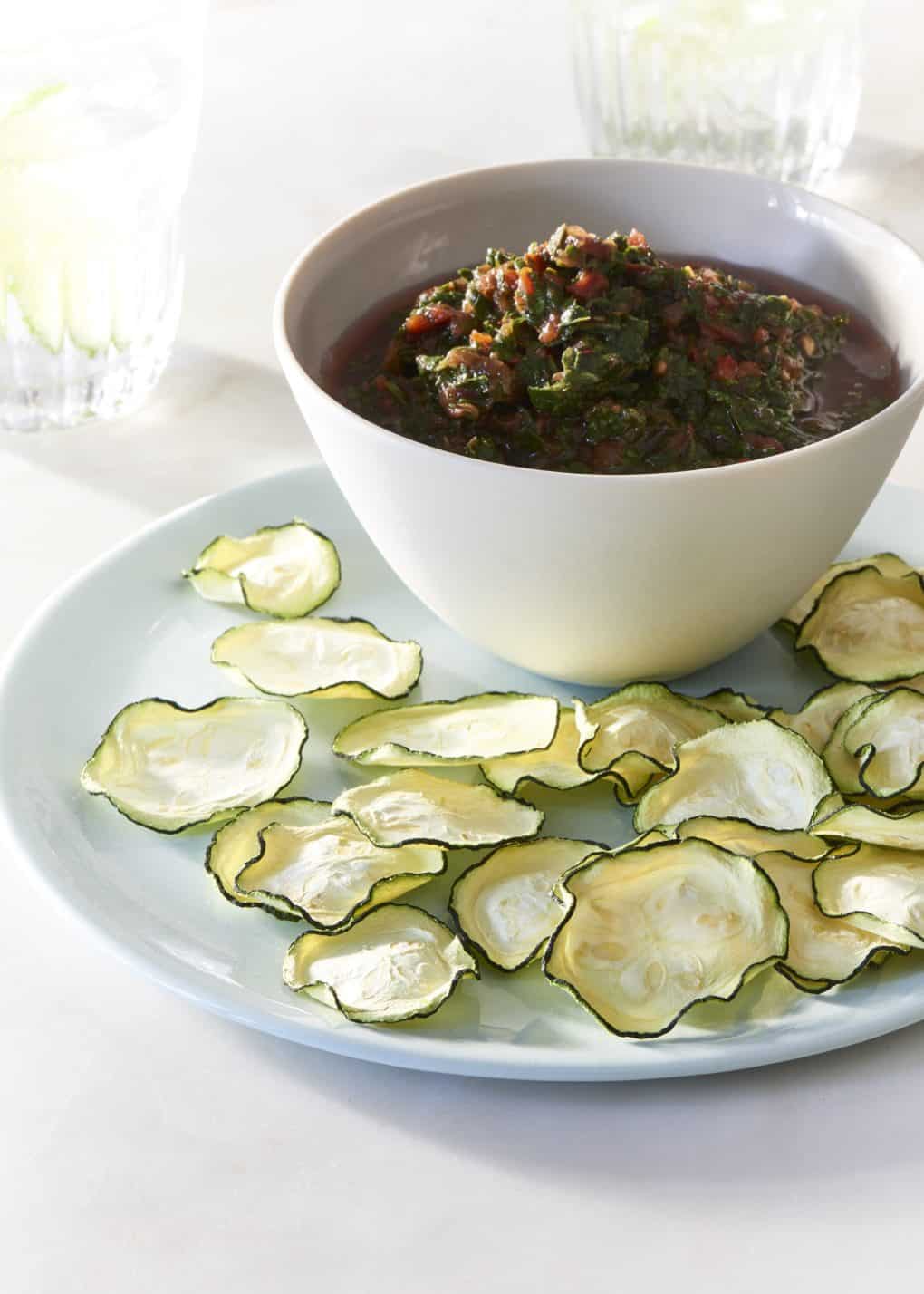 For the zucchini chips, slice the zucchini into 1/16th-inch slices with a mandoline.