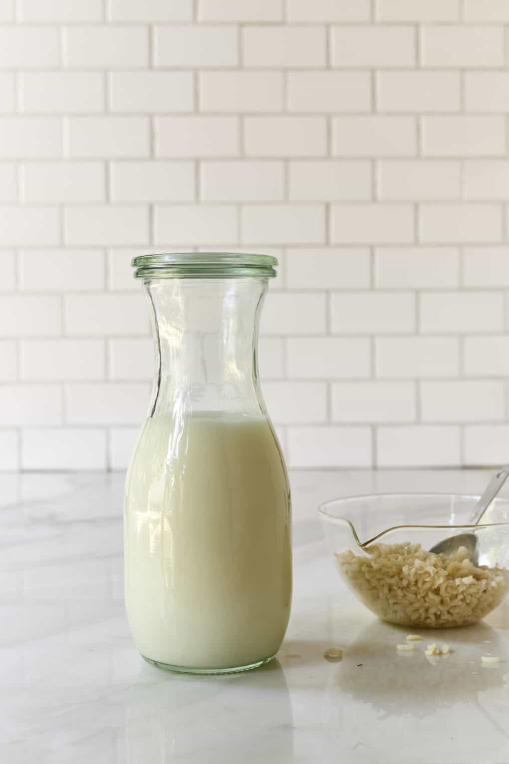Throw the cooked brown rice, water, and salt in your blender, with any additions (if using), and blast on high for about 60 seconds, until smooth and creamy. Use whole milk to maximize nutrition. Or strain for a smoother, more commercial-style milk for use in recipes.