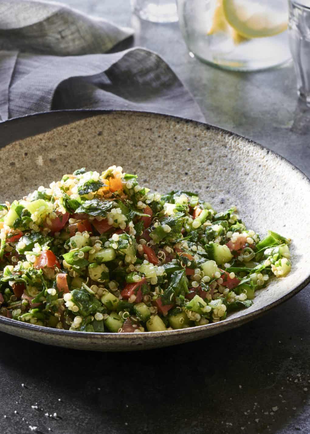 This quinoa tabouli is gluten-free and alkaline, and fresh and delicious. This version tastes just like conventional tabouli.