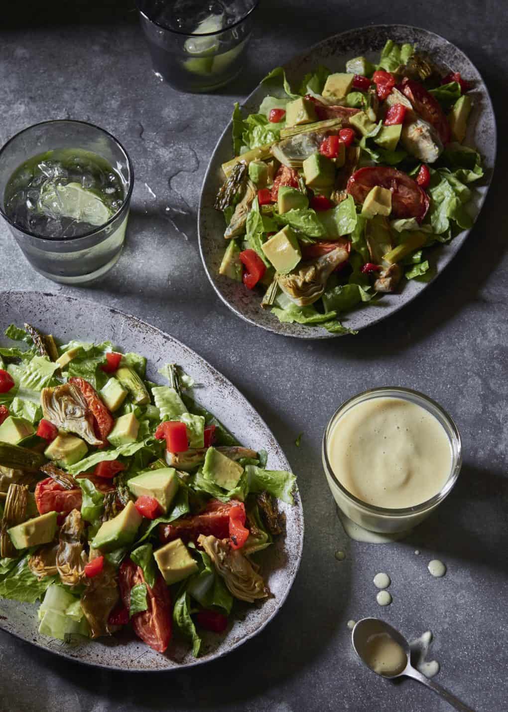 Megan says, “This salad is hearty enough to be served as a meal, thanks to a topping of warm roasted vegetables and creamy avocado. Because fresh artichokes can be tricky to work with, using frozen artichoke hearts will make things easier, without the preservatives found in the canned variety. Tender asparagus spears and meaty artichoke hearts add the perfect texture over crisp romaine lettuce, but feel free to use any other vegetables that may be in season. The result is delicious even when chilled, so you may want to prepare extra roasted vegetables to serve over your salads all week long.”