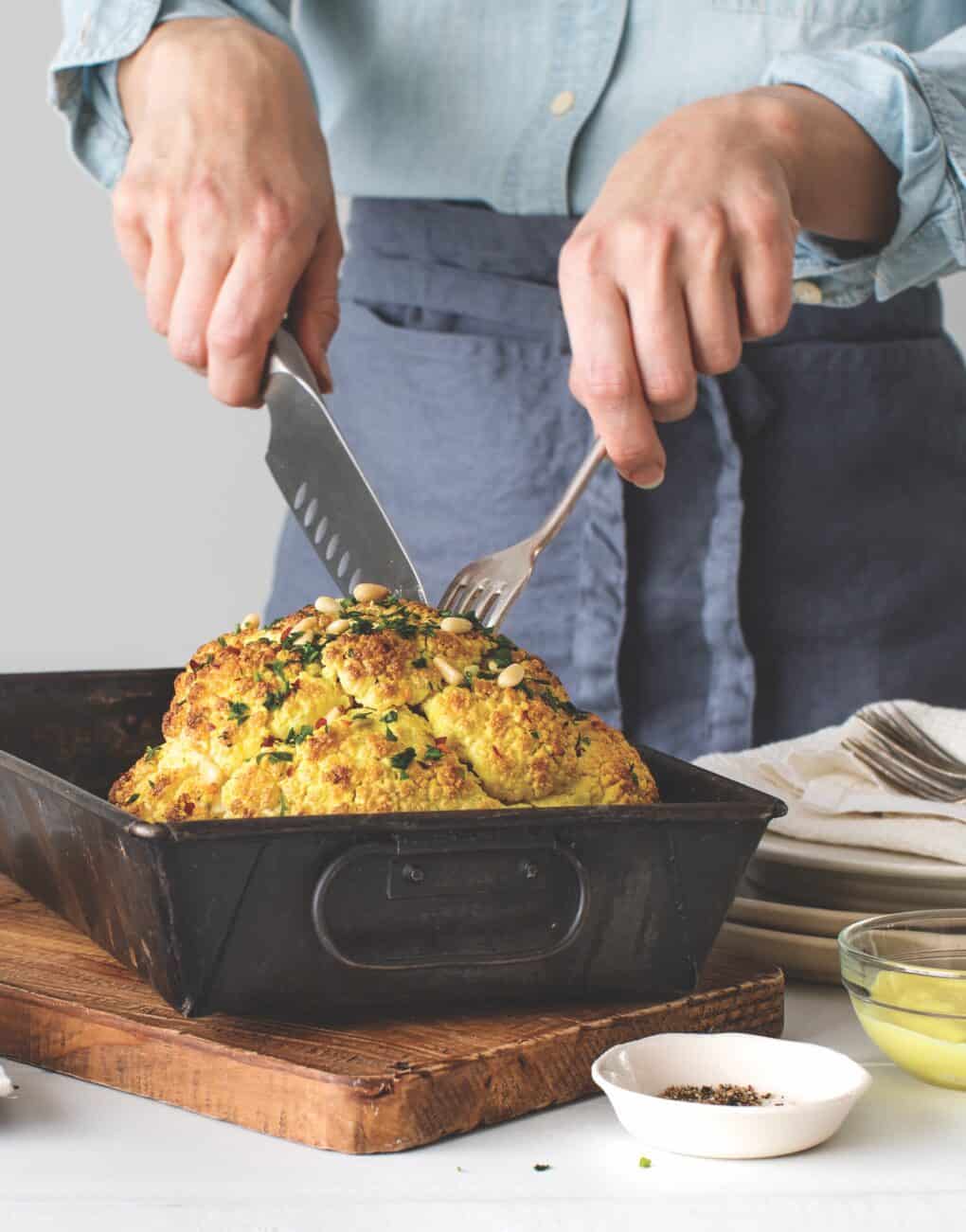 This turmeric spiced whole roasted cauliflower is really easy, looks gorgeous, and makes such a delicious meal that will satisfy the most ardent omnivores.