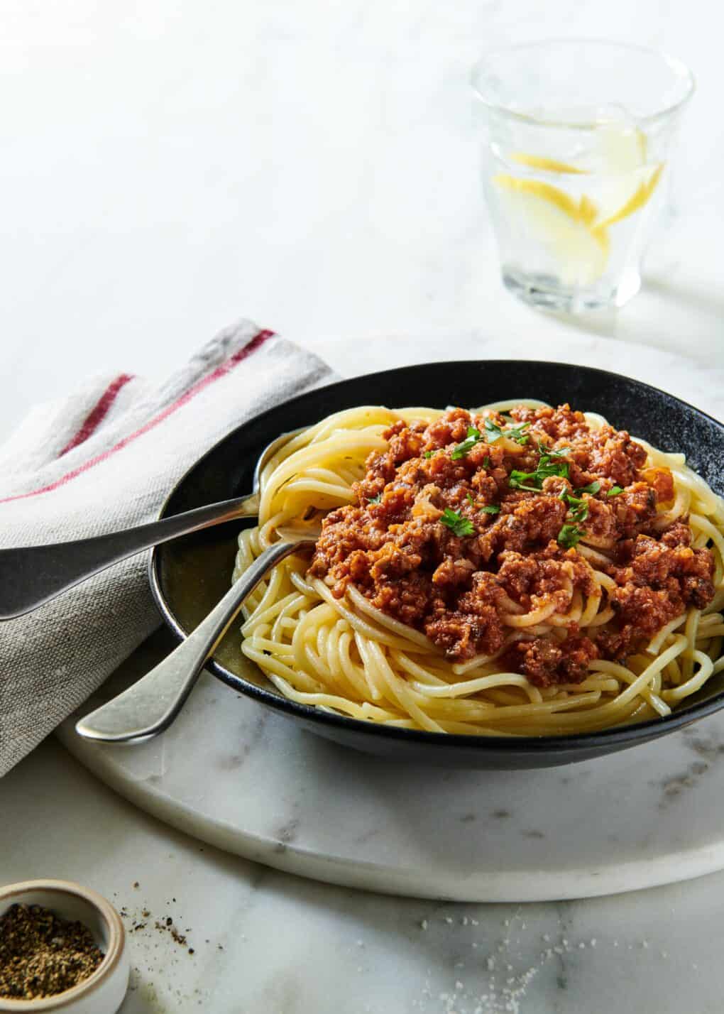 Serve pasta topped with bolognese sauce, and garnish with chopped parsley.