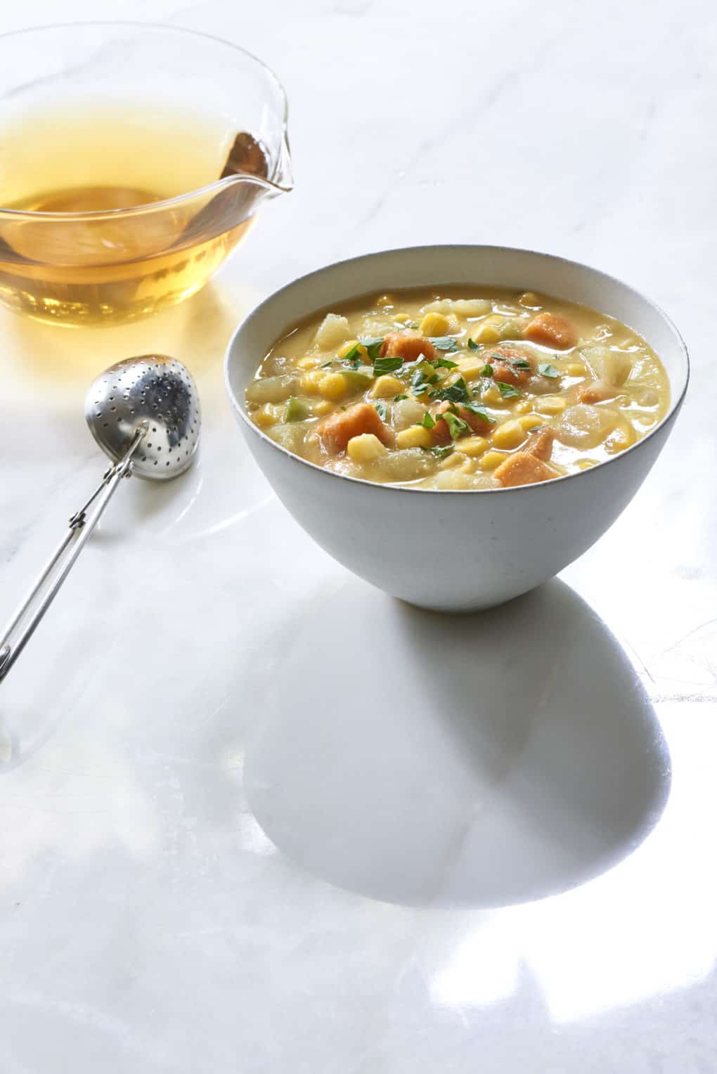 This vegetarian corn chowder infused with chamomile tea such has fabulous flavor. This is an elegant starter or simple dinner.